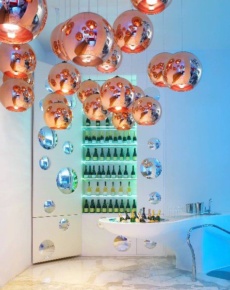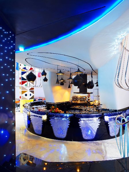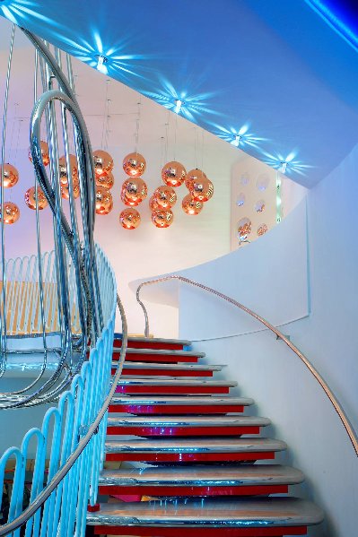 Der Empfangsbereich wird von 2 gigantischen, farbigen Säulen dominiert, inspiriert von einer Figur aus dem Karneval der Lombardei, dem Harlekin und wird von 4000 LED Lämpchen in Szene gesetzt.